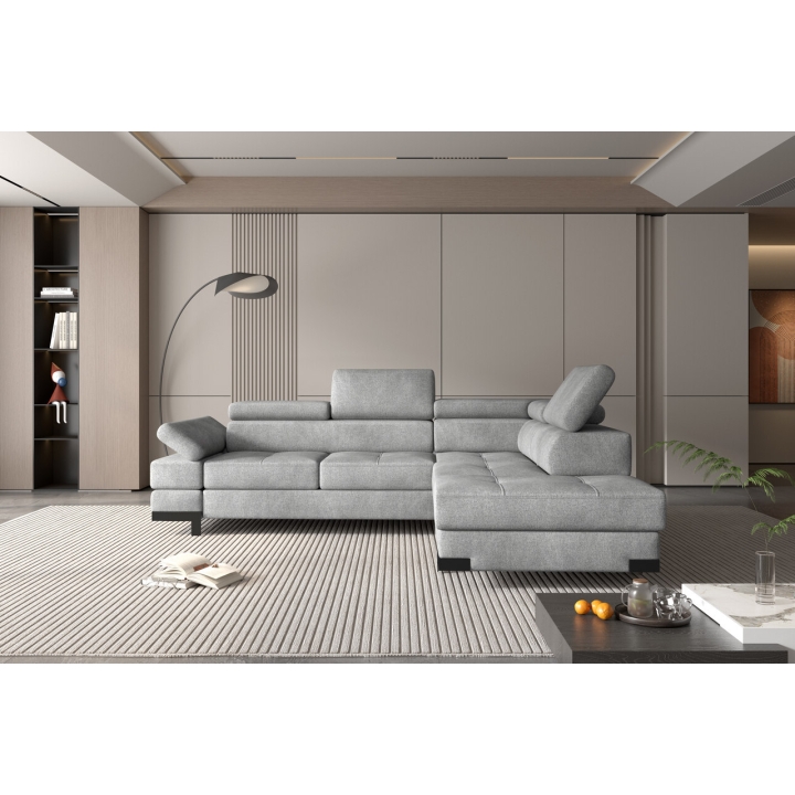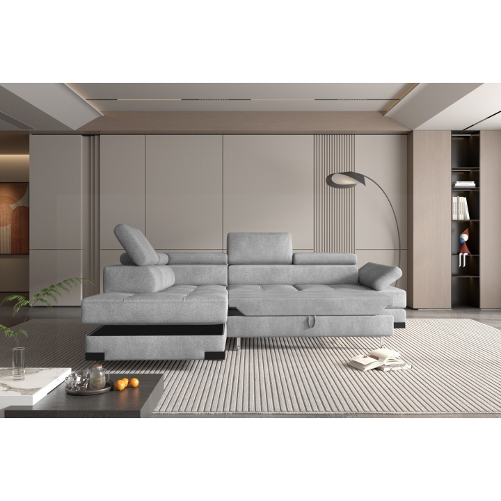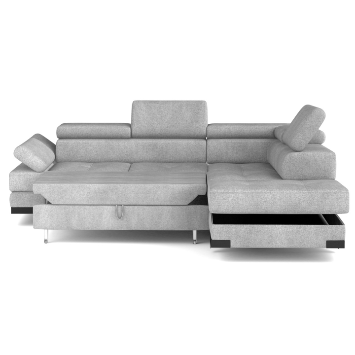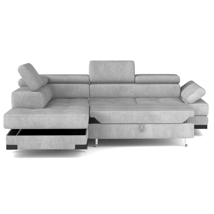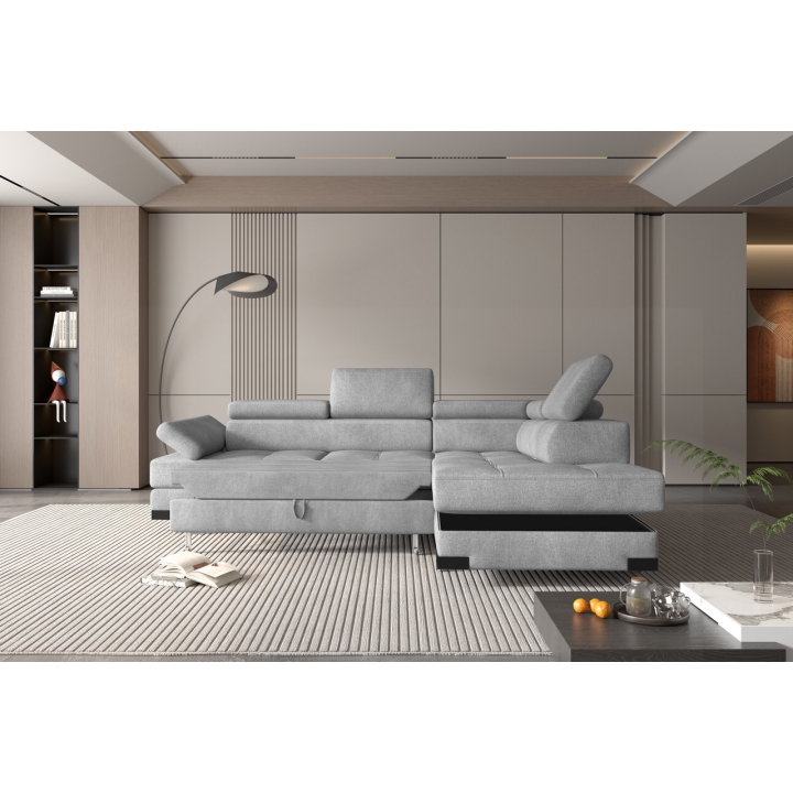 Among the significant advantages of the corner sofa is a sleeping function based on the dolphin type system. This mechanism allows you to quickly transform the furniture into a bed of 122x190 cm - just slide out the lower part and lift the mattress. In addition, the ottoman conceals a spacious storage compartment, ideal for storing quilts, pillows or other textiles, which allows you to keep your living space tidy.