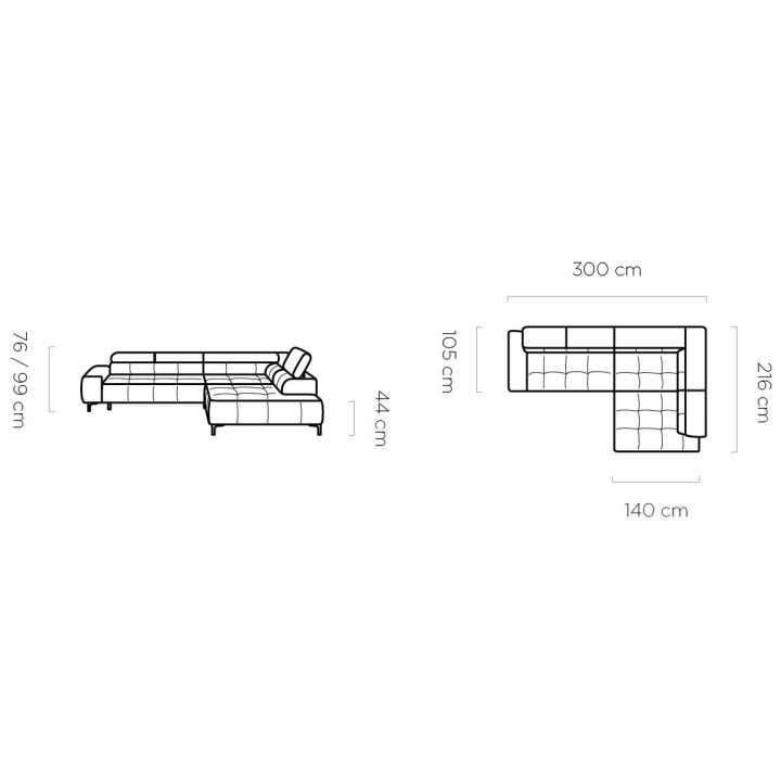 The total width of the corner is 300 cm, the height in the basic setting - 76 cm, and with the headrests raised - 99 cm. The depth of the longer side (on the ottoman side) is 216 cm, the shorter side (on the seat side) is 105 cm. The ottoman itself measures 140 cm wide and 172 cm deep (without the backrest), which allows you to rest in a reclining position. The depth of the seat is 62 cm, expandable to 88 cm. The seat height is 44 cm.