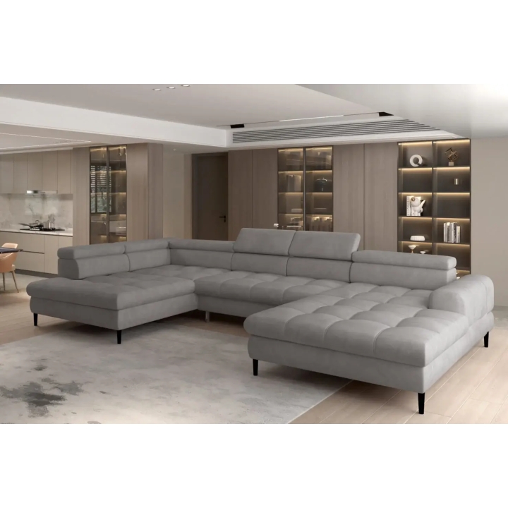 The Voss XL corner sofa from the Wersal manufacturer is an elaborate U-shaped lounge furniture, available in left- or right-handed versions. The total width of the structure is 373 cm, and the depth depends on the arms: 218 cm on the longer side and 177 cm on the shorter side. The height of the corner sofa when the headrests are folded is 77 cm, while when they are unfolded it reaches 94 cm.