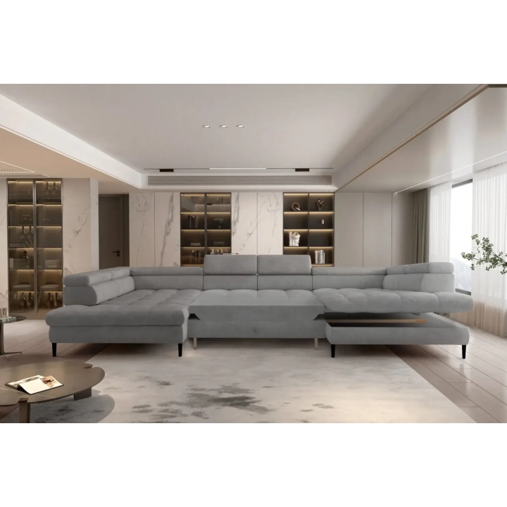 The corner sofa is equipped with a dolphin-type sleeping function and a bedding container, which allows it to be used as a place for night rest. The area when unfolded is 140 × 226 cm, which gives a comfortable space for two people. The unfolding mechanism is intuitive and easy to use.