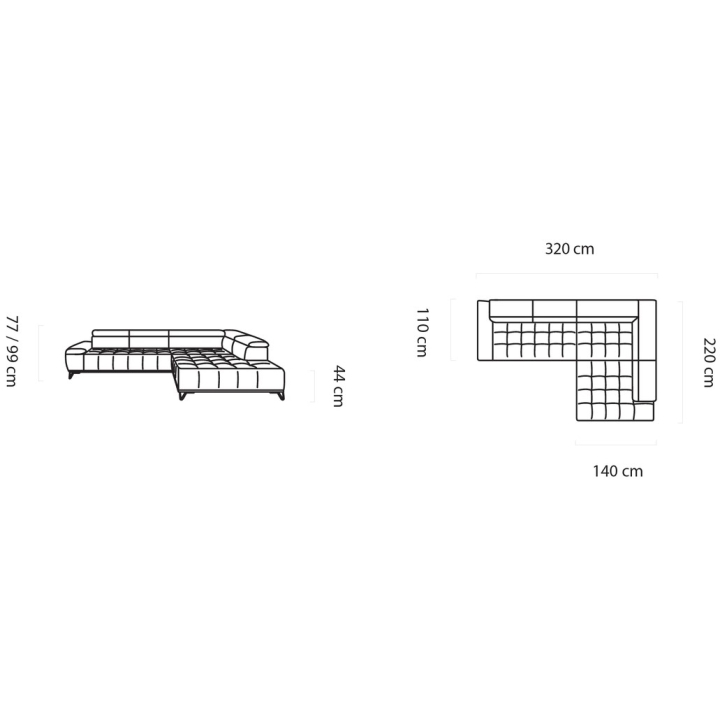 The structure of the furniture is based on an L-shape, offering comfortable proportions for more users. The total width is 320 cm, with a depth of 220 cm, while the shorter side measures 110 cm and the longer side 220 cm. The height of the corner sofa is 77 cm, which increases to 99 cm with the headrests extended, and the width of the ottoman reaches 140 cm.