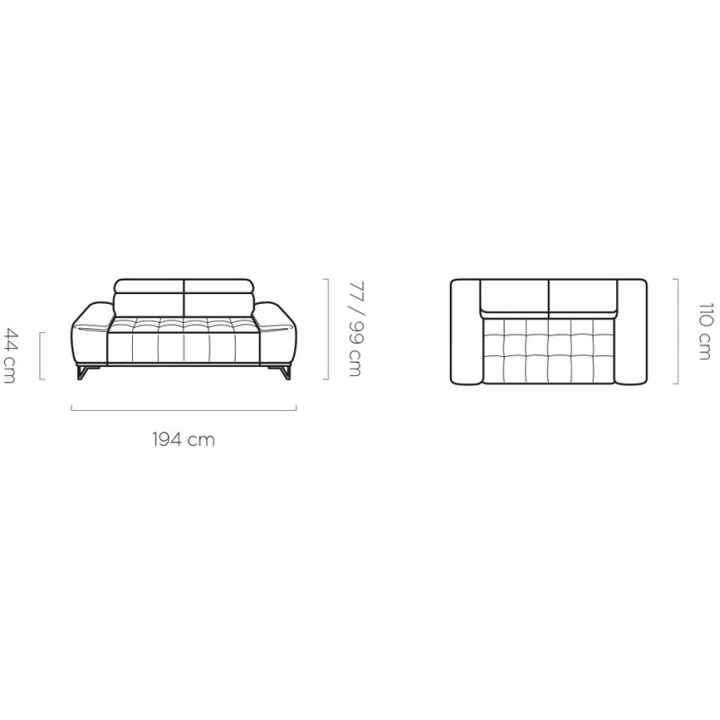The furniture measures 194 cm in width, 77 cm in height in the folded position of the headrests and 99 cm when they are raised. The overall depth is 110 cm, while the seat depth is 66 cm. The seat height of 44 cm allows you to stand up and sit down comfortably.