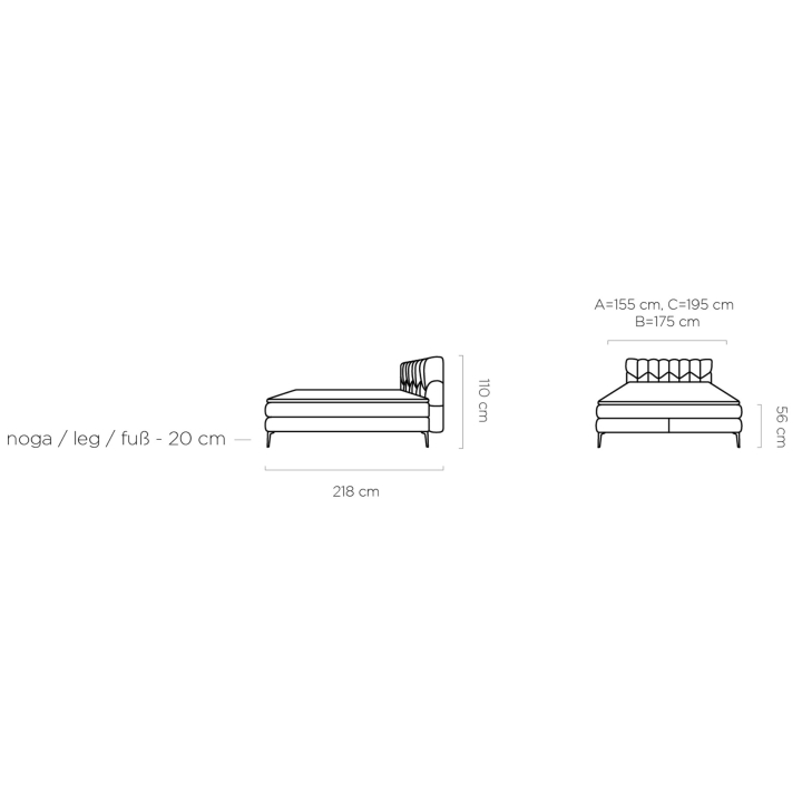 The overall dimensions are 155 cm wide, 110 cm high, 218 cm deep, with a sleeping height of 55 cm. Sturdy black metal legs with a height of 20 cm add visual lightness to the whole, while providing adequate strength. The bed is delivered in 4 packages, designed for self-assembly, which makes it easy to transport and bring the furniture into the room.