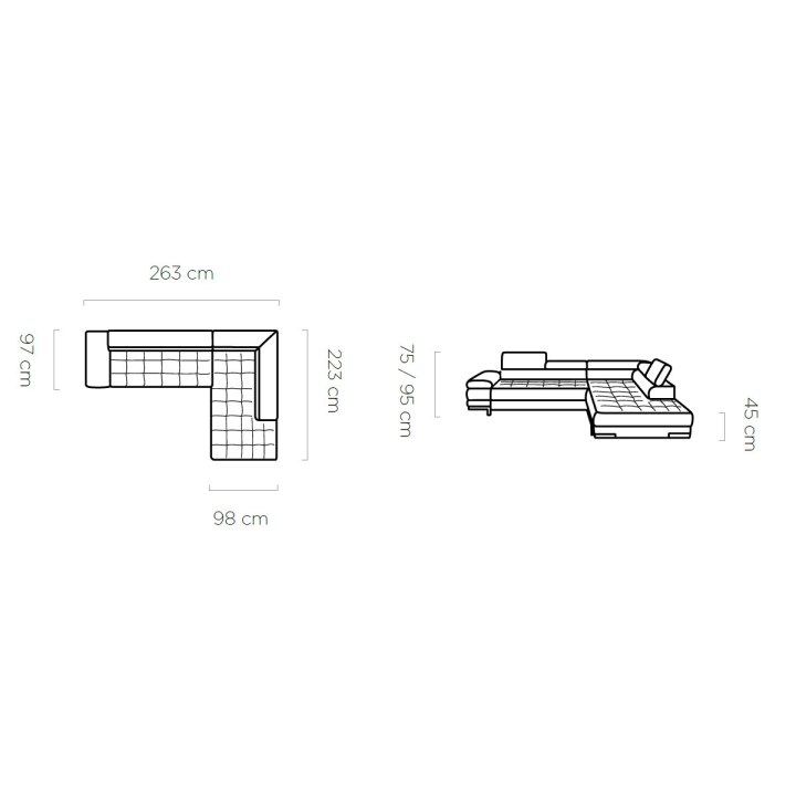 The structure is 263 cm wide and 75 cm high, reaching 95 cm when the headrests are raised to their maximum height. The shorter side of the corner (on the seat side) measures 97 cm deep, while the longer side (on the ottoman side ) measures 223 cm. The ottoman itself is 98 cm wide, providing a spacious resting area. The whole is supported by slender black legs with a matte surface, bringing an additional visual accent to the solid.
