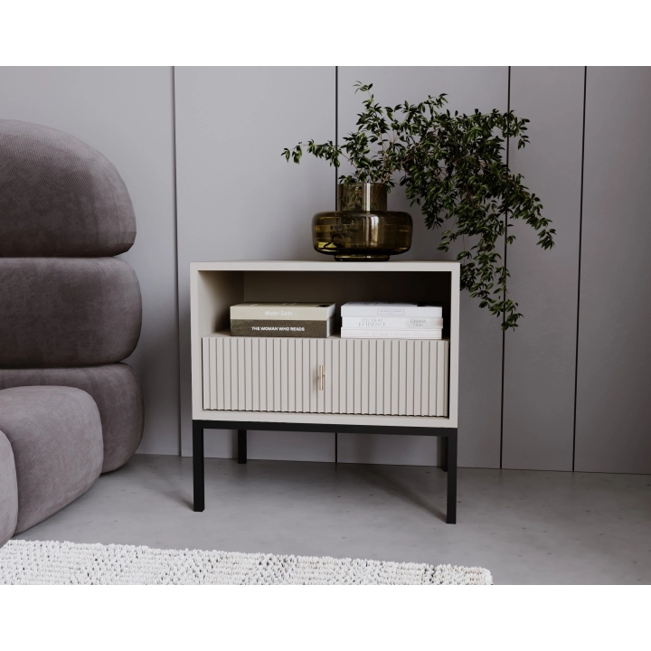Its compact dimensions - 53.9 cm wide, 39 cm deep and 52.4 cm high - make it ideal for smaller spaces, while providing space for storing essential items. A single door allows easy access to the interior, and the high legs add lightness to the whole piece, allowing you to keep the space around the furniture clean.