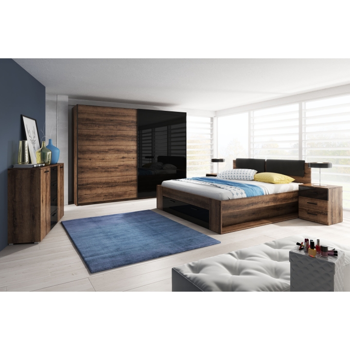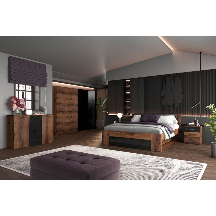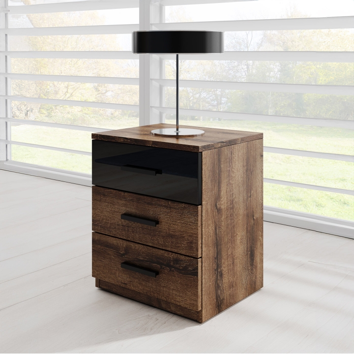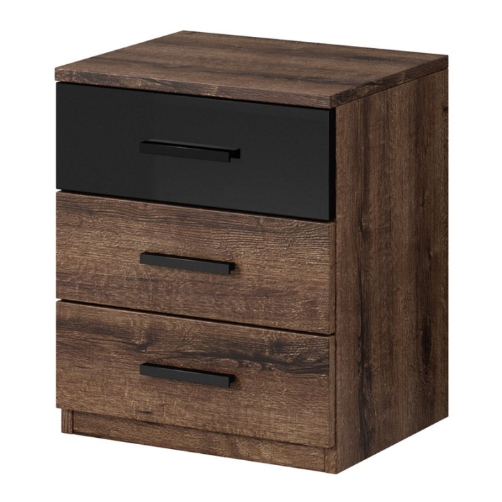 The Galaxy 22 bedside cabinet by Helvetia is a compact piece of bedroom furniture in oak monastery / black decor. Its fronts are made of MDF covered with PVC foil, while the body is made of damage-resistant furniture board. The front has a matt gloss finish, while the body has a matt finish, which creates an interesting contrast and emphasises the modern character of the unit.