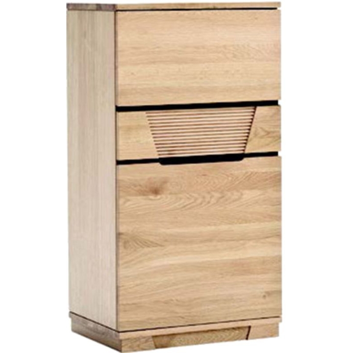 The ZakorI chest of drawers is the smallest available in the Hatillo collection. In its upper and lower parts there are lockable cabinets. The centre of the chest is a drawer for handy household items. A decorative brown insert is used between the fronts to break up the natural style of the furniture. Thanks to its small size, it will be ideal for small interiors. The use of high quality materials will ensure durability and strength. We invite you to take a look at the rest of the furniture offer from the Hatillo collection by furniture manufacturer Zakor.