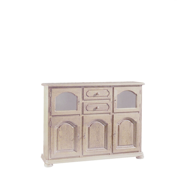 The buffet from the Tilburg collection by manufacturer Zakor is a wonderful classic design. It has two levels - an upper level with glass fronts and drawers, and a lower level with three cabinets. The cabinet located at the bottom has shelves. The upper level features two capacious drawers and two cabinets with glazed fronts You can display souvenirs, decorations and tableware in them to enjoy their appearance at all times. Each piece of furniture has a classic design - from the turned wooden legs, to the milled edges of the base and top, to the decorative beading on the fronts of the cabinets and drawers. The buffet is robust and scratch-resistant. The metal fittings give it a unique character. We invite you to check out the rest of the pieces in the classic Tilburg collection by furniture manufacturer Zakor in our offer.