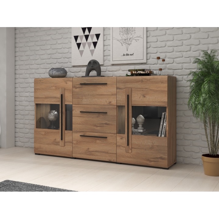 Komoda Tulsa Typ 28 marki Helvetia Wieruszów to mebel stworzony z myślą o estetyce i wygodzie użytkowania. Została wyposażona w dwoje drzwi, trzy szuflady na pełen wysuw oraz cztery półki, z czego dwie są przeszklone, co pozwala na wyeksponowanie dekoracji lub ulubionej zastawy. Dzięki temu komoda łączy w sobie funkcję przechowywania oraz prezentacji wybranych przedmiotów.