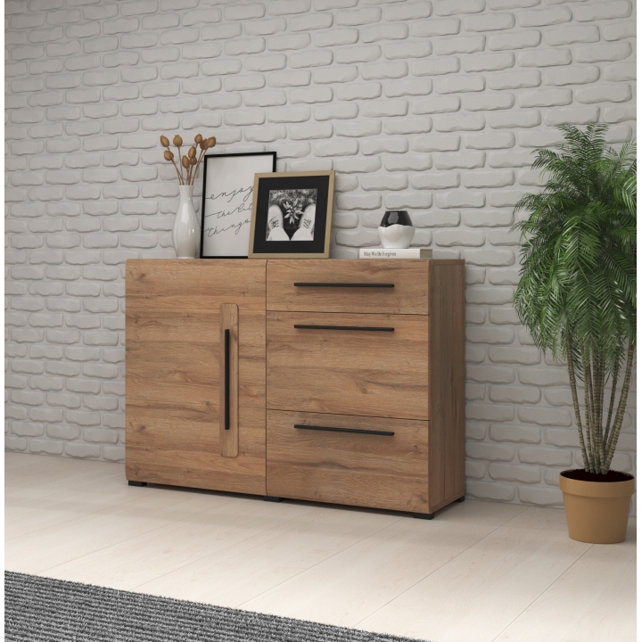 Wymiary komody wynoszą: szerokość 120 cm, wysokość 86 cm, głębokość 39 cm, dzięki czemu mebel sprawdzi się zarówno w przestronnych, jak i mniejszych pomieszczeniach. Proporcje bryły zostały tak zaplanowane, aby komoda nie przytłaczała wnętrza, a jednocześnie oferowała odpowiednią ilość miejsca do przechowywania. To rozwiązanie, które sprawdzi się w salonie, sypialni czy jadalni.