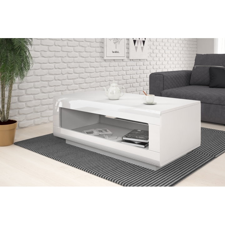 Model dostępny jest w dwóch wariantach kolorystycznych: biały laminat z wykończeniem na wysoki połysk oraz Dąb Grandson w całości utrzymany w naturalnej tonacji drewna. Oba wybarwienia pozwalają dopasować stolik do różnorodnych aranżacji – od jasnych, minimalistycznych przestrzeni po wnętrza o cieplejszym charakterze.