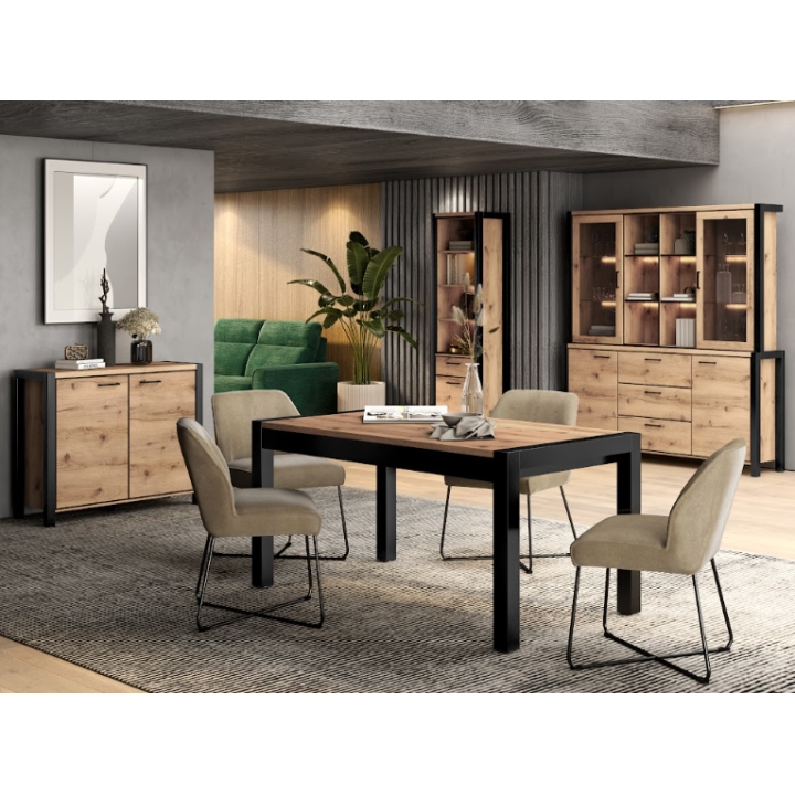 Mebel wykonano z płyty meblowej, przy czym fronty oraz fragmenty boków powstały z płyty MDF, co gwarantuje trwałość oraz staranne wykończenie powierzchni. Uchwyty z czarnego metalu wprowadzają wyraźny kontrast i akcent industrialny, a zastosowane obrzeża ABS w widocznych miejscach chronią przed uszkodzeniami i podnoszą odporność na codzienne użytkowanie. Zastosowane materiały czynią całość solidną i estetyczną.