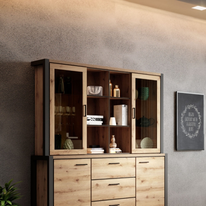 Dodatkowym atutem jest możliwość wyposażenia nadstawki w oświetlenie LED, które subtelnie wydobędzie walory wyeksponowanych przedmiotów oraz wprowadzi do pomieszczenia nastrojową atmosferę. Dzięki temu mebel nie tylko zwiększa możliwości aranżacyjne, ale także wprowadza do wnętrza wyjątkowy klimat. To propozycja dla osób poszukujących połączenia efektownego designu z wygodą użytkowania.