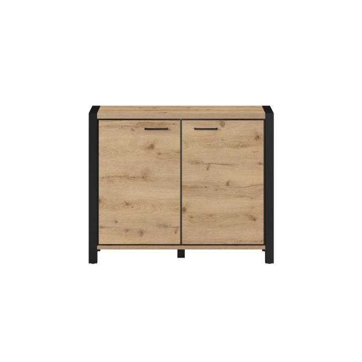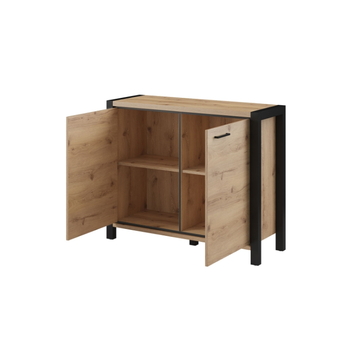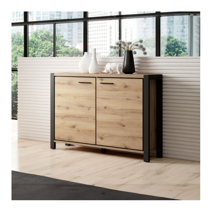 Wymiary komody to szerokość 112 cm, wysokość 91 cm oraz głębokość 41 cm, co czyni ją meblem o proporcjonalnej budowie, pozwalającym na optymalne zagospodarowanie przestrzeni. Dwudrzwiowa konstrukcja kryje w sobie półki, które zapewniają miejsce do uporządkowania różnego rodzaju przedmiotów. Czarne, metalowe uchwyty nie tylko pełnią rolę użytkową, lecz także podkreślają zdecydowany charakter bryły.