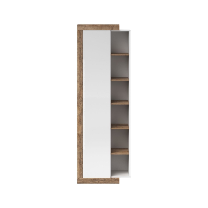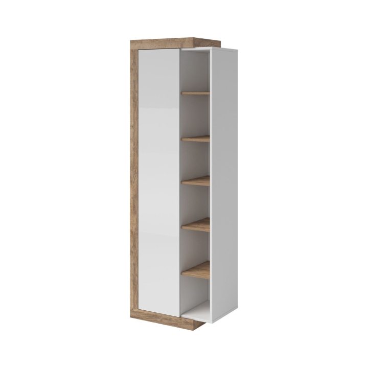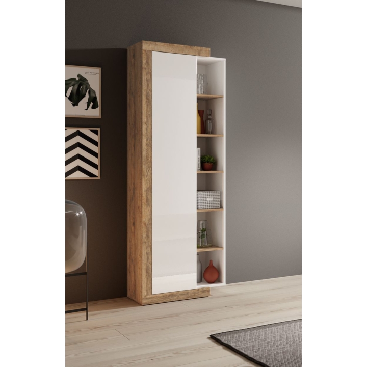 Kolorystyka witryny to zestawienie odcienia dąb Samdal z bielą, które nadaje jej uniwersalnego charakteru i pozwala na łatwe dopasowanie do różnorodnych aranżacji. Jasne wybarwienie rozjaśnia przestrzeń, jednocześnie podkreślając naturalne usłojenie dekoru. To zestawienie barw wprowadza do wnętrza poczucie świeżości i lekkości.