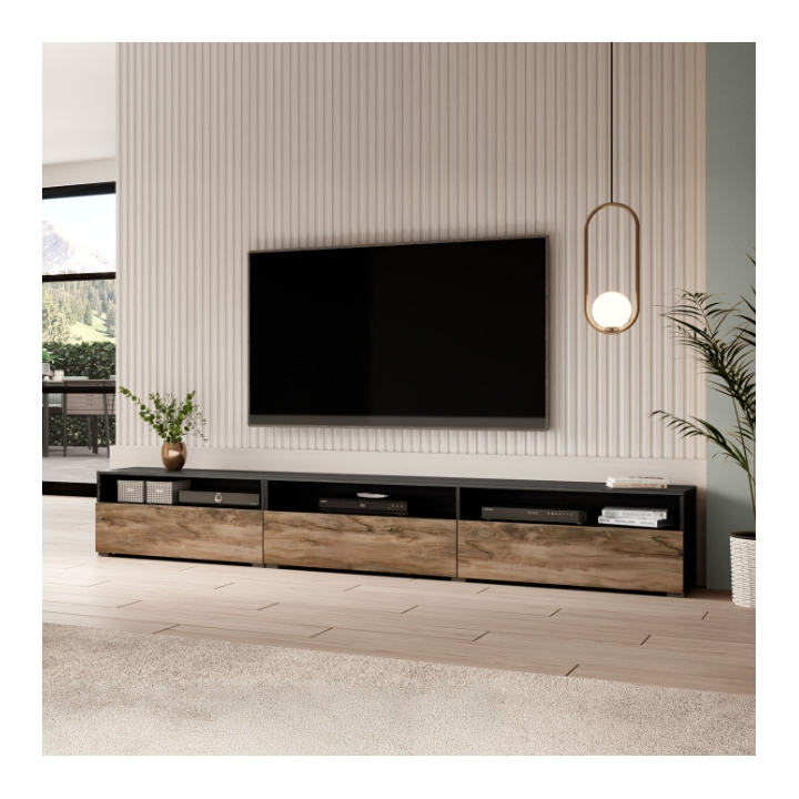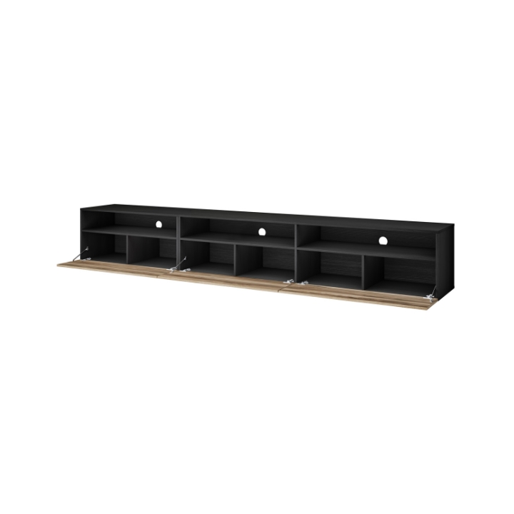 Całość mierzy 270 cm szerokości, 42 cm wysokości oraz 41 cm głębokości. Mebel posiada 3 fronty otwierane w dół, za którymi znajdują się małe szafki, każda dodatkowo podzielona półką. To wygodne miejsce do przechowywania płyt, przewodów czy drobniejszych urządzeń, które warto ukryć.