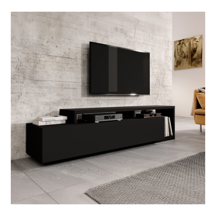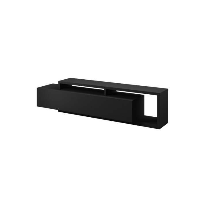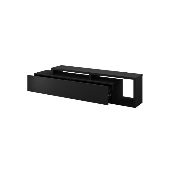 W górnej części szafki znajdują się dwie wnęki oddzielone nadstawką, które znakomicie sprawdzają się jako miejsce na dekoder czy konsolę. Przewody można w nich poprowadzić w dyskretny sposób, aby zachować porządek wokół strefy telewizyjnej. Szeroka i głęboka szuflada zapewnia dodatkową przestrzeń na dokumenty, akcesoria elektroniczne, a także kolekcje płyt i gier.