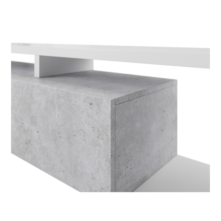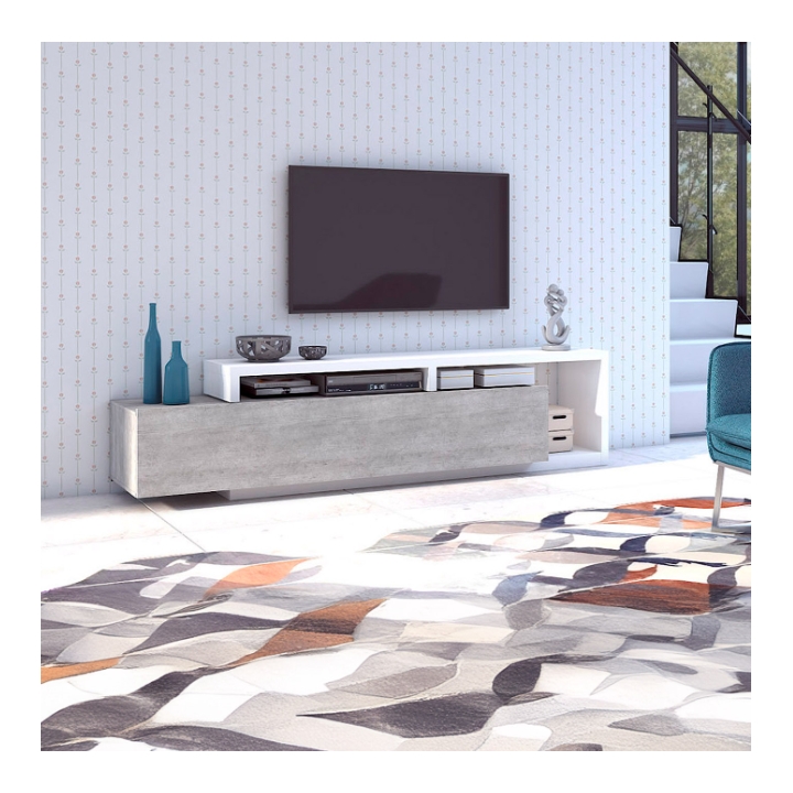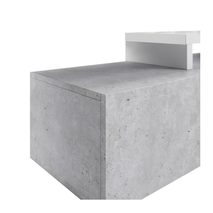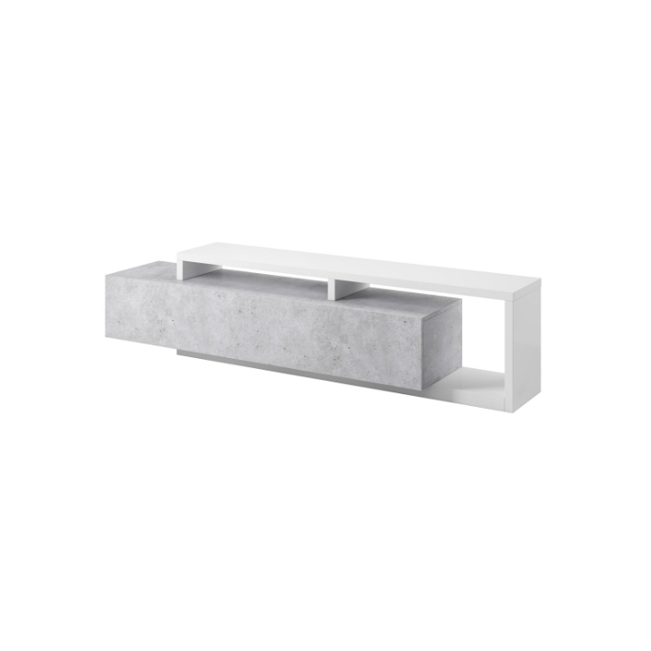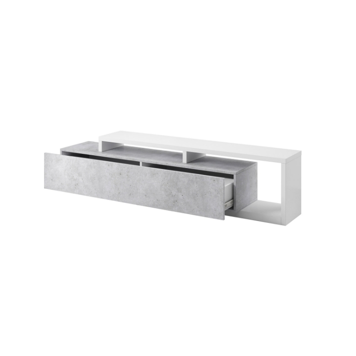 W górnej części szafki znajdują się dwie wnęki oddzielone nadstawką, które znakomicie sprawdzają się jako miejsce na dekoder czy konsolę. Przewody można w nich poprowadzić w dyskretny sposób, aby zachować porządek wokół strefy telewizyjnej. Szeroka i głęboka szuflada zapewnia dodatkową przestrzeń na dokumenty, akcesoria elektroniczne, a także kolekcje płyt i gier.