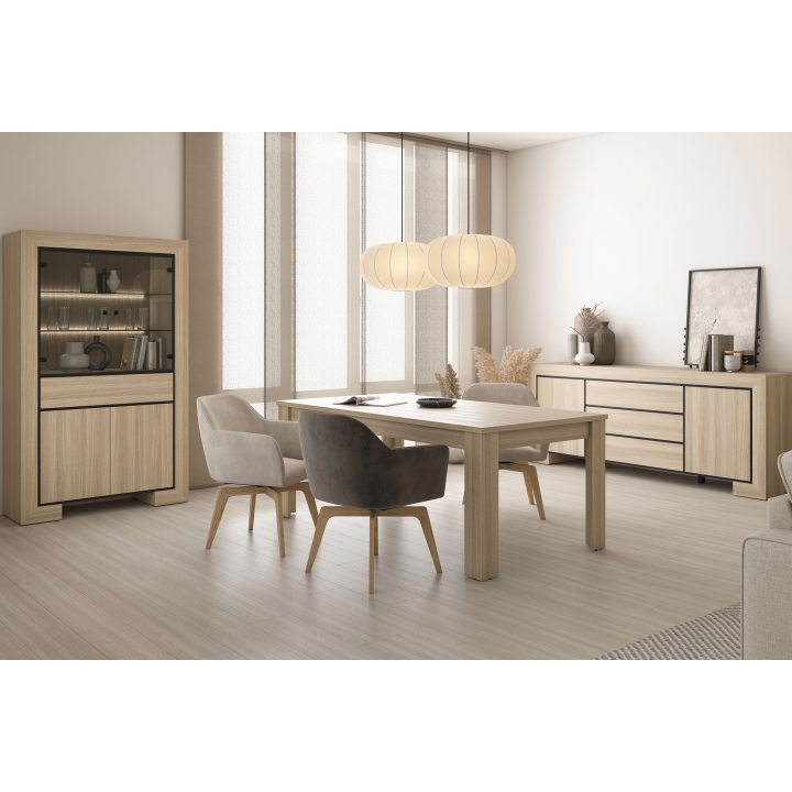 Mebel stoi na niskich nogach w kolorze elegant oak, co nadaje konstrukcji proporcjonalność i pozwala na łatwe wpasowanie go w różne przestrzenie – od salonu, przez jadalnię, po gabinet. Nóżki nie tylko stabilizują całość, ale też umożliwiają łatwiejsze utrzymanie czystości pod meblem.
