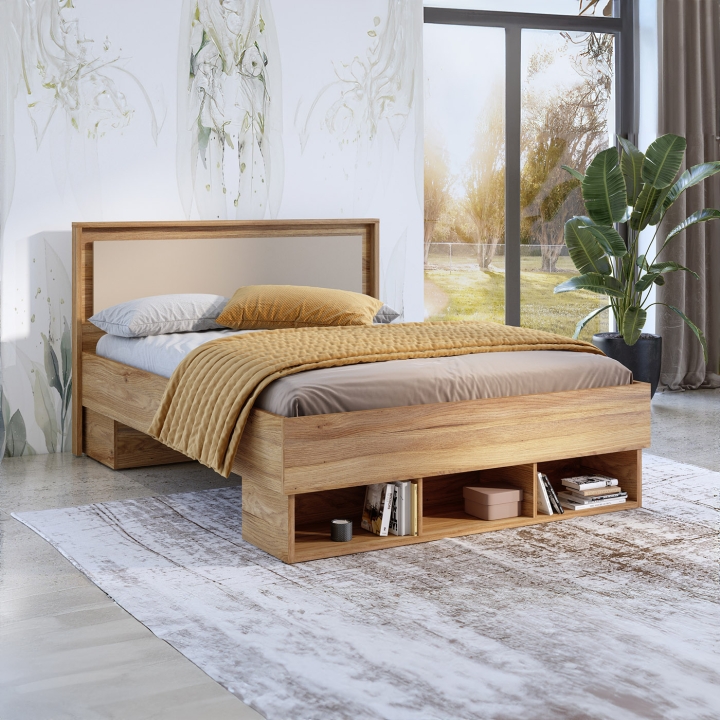Bryła łóżka posadowiona jest bezpośrednio na cokole. Brak klasycznych nóżek sprawia, że mebel przylega do podłoża i tworzy zwartą, osadzoną sylwetkę. Boki łóżka oraz zanóżek są gładkie, bez dodatkowych detali czy frezów. Front i boki zachowują jednolity kierunek usłojenia, co podkreśla spójność projektu. Całość wykonano z płyty meblowej wykończonej w dekorze imitującym naturalne drewno, o ciepłym, złamanym odcieniu brązu.