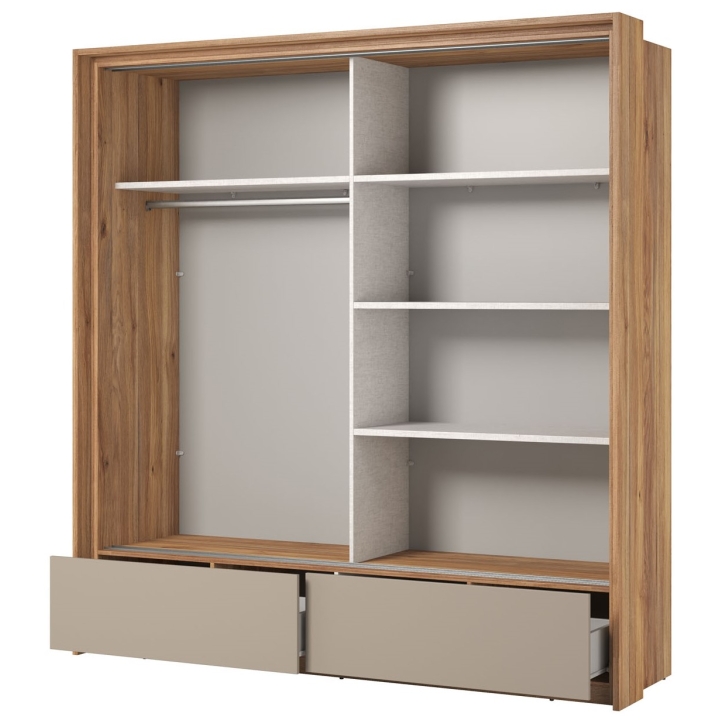 Wnętrze szafy podzielono na dwie odrębne części. Jedna z nich została wyposażona w drążek, który umożliwia zawieszenie odzieży – koszul, marynarek, płaszczy czy sukienek. Druga strona kryje w sobie zestaw półek o pełnej głębokości, przeznaczonych do przechowywania złożonych ubrań, kompletów pościeli, pudełek bądź innych tekstyliów. Dodatkowo w dolnej części konstrukcji znajdują się dwie szuflady, pozwalające uporządkować drobniejsze przedmioty, które warto mieć pod ręką.