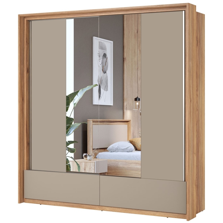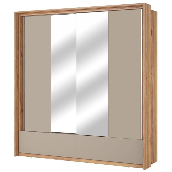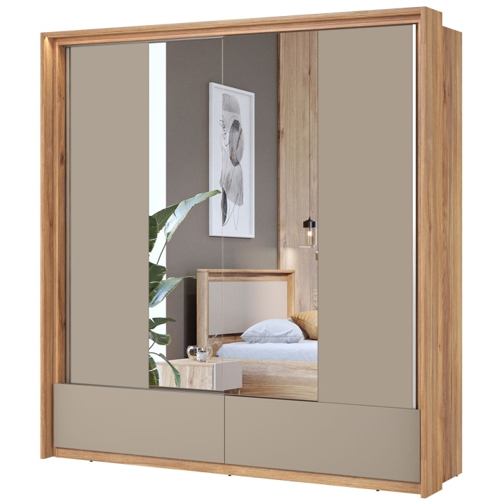 Szafa może być elementem większej zabudowy, gdyż w kolekcji dostępne są również inne bryły w tych samych dekorach. Dzięki temu możliwe jest stworzenie spójnego aranżacyjnie wnętrza. W zestawie nie przewidziano oświetlenia.