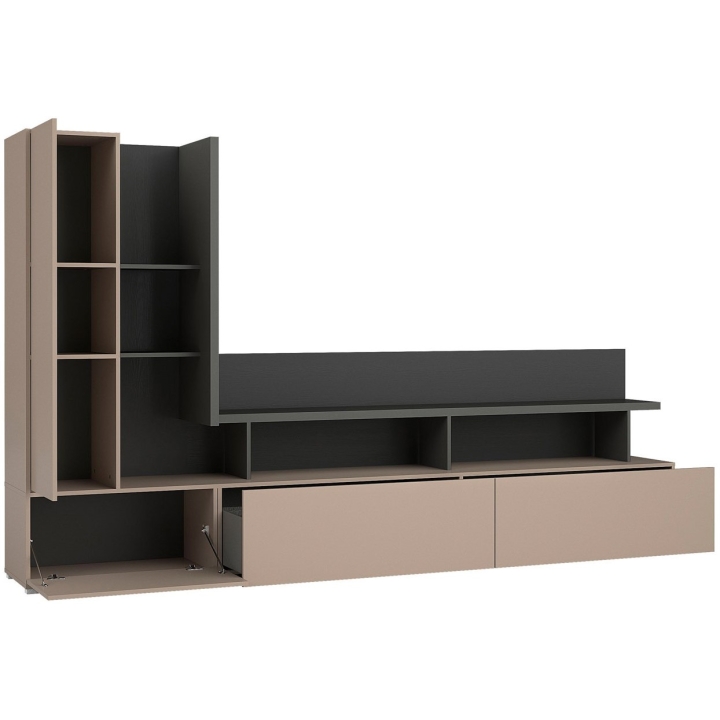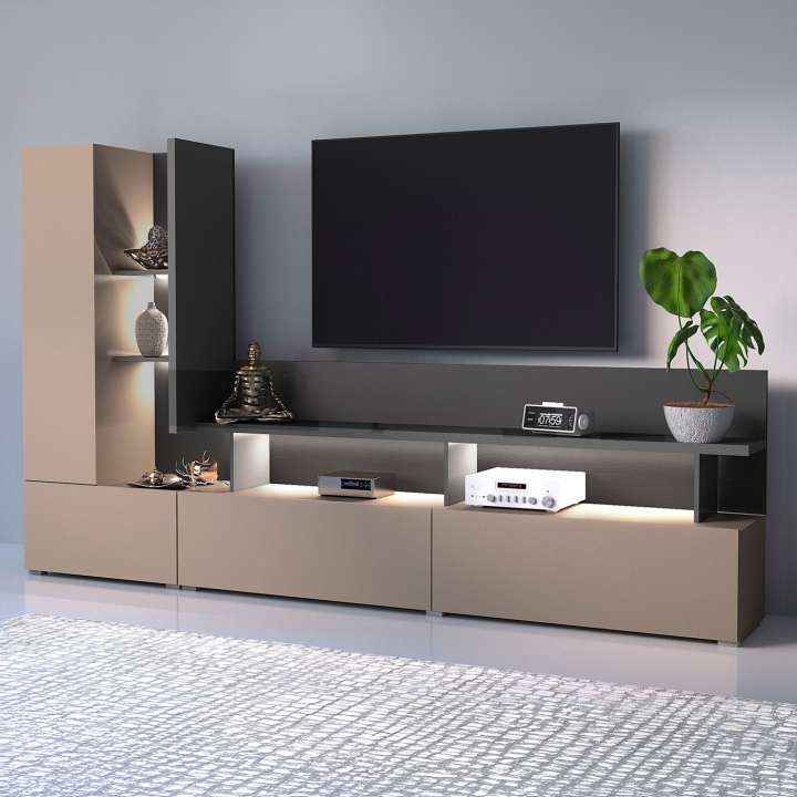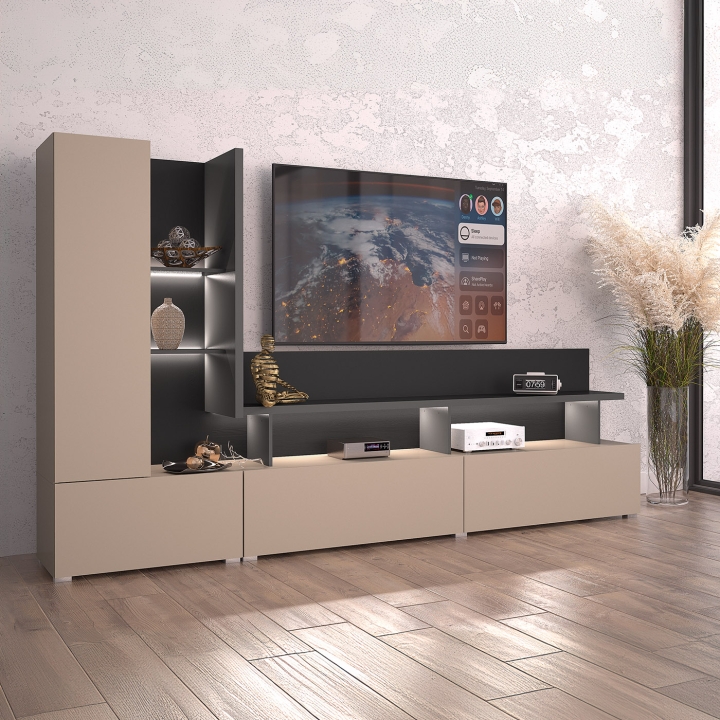 Jej proporcje zostały starannie zaplanowane – szerokość 270 cm, wysokość 162 cm oraz głębokość 40 cm sprawiają, że mebel sprawdzi się zarówno w przestronnych, jak i średniej wielkości wnętrzach. Konstrukcja zapewnia możliwość ustawienia telewizora, książek, dekoracji czy sprzętu multimedialnego w wygodny i uporządkowany sposób.