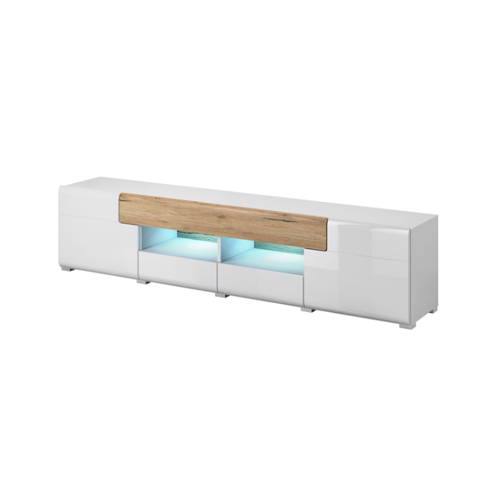 Konstrukcja szafki ma 208 cm szerokości, 47 cm wysokości i 39 cm głębokości, co pozwala na swobodne przechowywanie wielu akcesoriów. Po bokach umieszczono dwoje drzwi, a środek urozmaicono jedną długą szufladą. Bezpośrednio pod nią znajdują się dwie niewielkie otwarte przestrzenie, w sam raz na dekoder czy odtwarzacz, a całość dopełniają dwie dodatkowe szuflady u dołu.