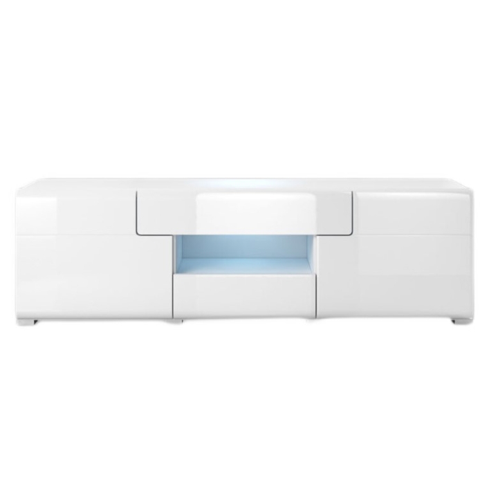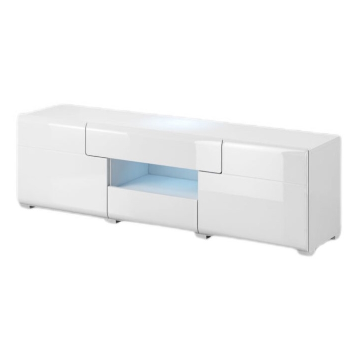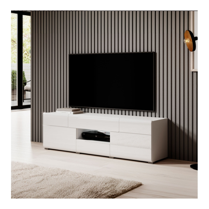 Mebel o wymiarach 159 cm szerokości, 47 cm wysokości i 39 cm głębokości doskonale odnajdzie się również w mniejszych przestrzeniach, jednocześnie zapewniając odpowiednią ilość miejsca na przechowywanie. Po obu stronach znajdują się drzwi, a centralna część wzbogacona została o długą szufladę w kontrastowym odcieniu. Pod nią umieszczono otwartą wnękę przeznaczoną na dekoder bądź odtwarzacz, a całość uzupełnia dodatkowa szuflada w dolnej partii.