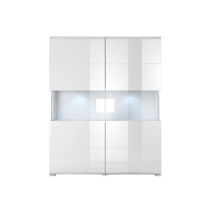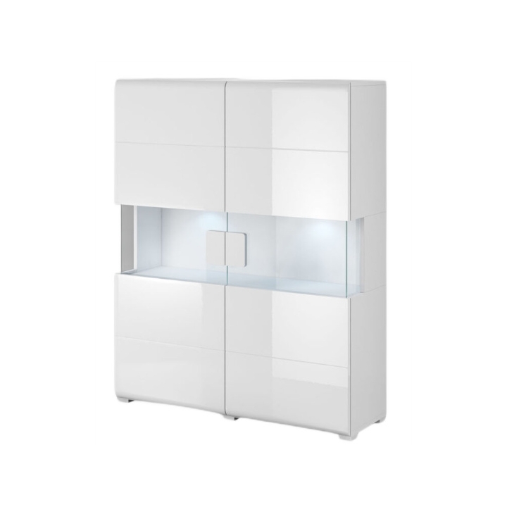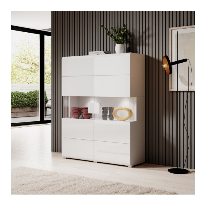 Konstrukcja opiera się na solidnej płycie meblowej, a obrzeża w miejscach widocznych zostały wykończone ABS, co zwiększa trwałość. Front jest częściowo przeszklony, co pozwala wyeksponować ulubione przedmioty, a dodatkowe oświetlenie LED - dostępne opcjonalnie, potęguje wizualny efekt. Takie rozwiązanie nadaje witrynie indywidualnego charakteru i tworzy przyjemny nastrój w pomieszczeniu.