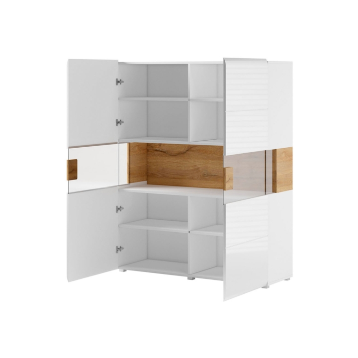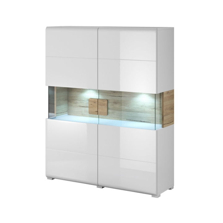 Konstrukcja opiera się na solidnej płycie meblowej, a obrzeża w miejscach widocznych zostały wykończone ABS, co zwiększa trwałość. Front jest częściowo przeszklony, co pozwala wyeksponować ulubione przedmioty, a dodatkowe oświetlenie LED - dostępne opcjonalnie, potęguje wizualny efekt. Takie rozwiązanie nadaje witrynie indywidualnego charakteru i tworzy przyjemny nastrój w pomieszczeniu.