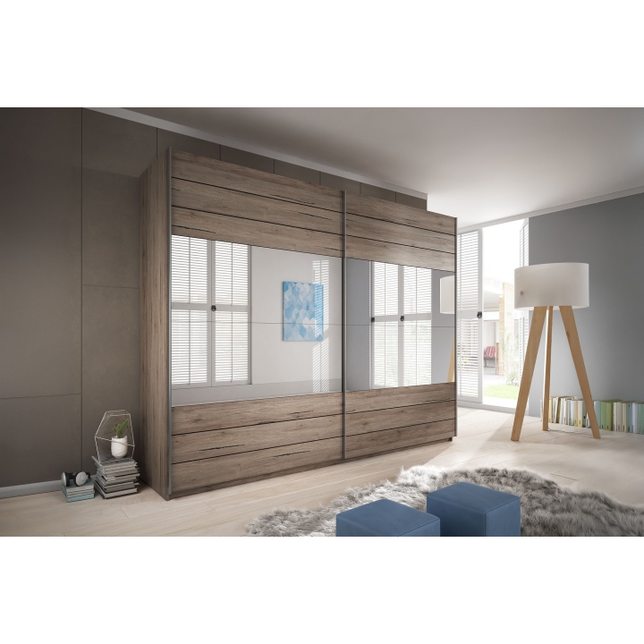 Całość została wykończona w odcieniu San remo ciemne z wkomponowanym lustrem, co nadaje meblowi wyrazisty charakter. Dzięki temu szafa nie tylko spełnia rolę miejsca do przechowywania, ale również wprowadza do wnętrza element podkreślający jego estetykę. To propozycja, która łączy solidne wykonanie z nowoczesnym wzornictwem, oferując mebel na lata.