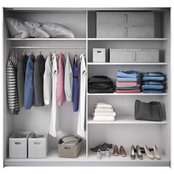Wnętrze szafy zostało starannie rozplanowane tak, aby ułatwić utrzymanie ładu i szybki dostęp do poszczególnych części garderoby. Do dyspozycji użytkownika oddano 5 półek przeznaczonych do przechowywania odzieży składanej oraz 1 drążek do ubrań wiszących. Taki układ sprawia, że wszystkie elementy garderoby mają swoje miejsce i pozostają dobrze uporządkowane.