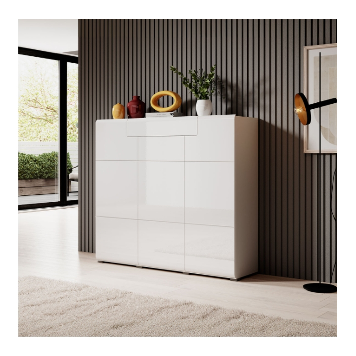 Całość powstała z płyty meblowej, a na krawędziach zastosowano obrzeże ABS, co podnosi trwałość i chroni przed uszkodzeniami. Szuflada w górnej strefie mebla w dwóch wariantach kolorystycznych występuje w odcieniu dębu, stanowiąc delikatny akcent wizualny. Subtelne detale podkreślają nowoczesny charakter komody, czyniąc ją wyważonym dodatkiem do wnętrza.