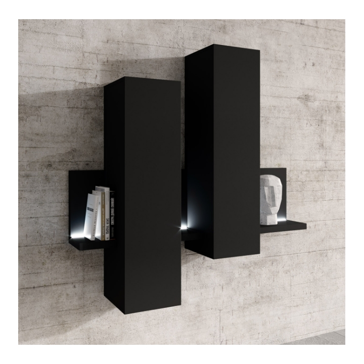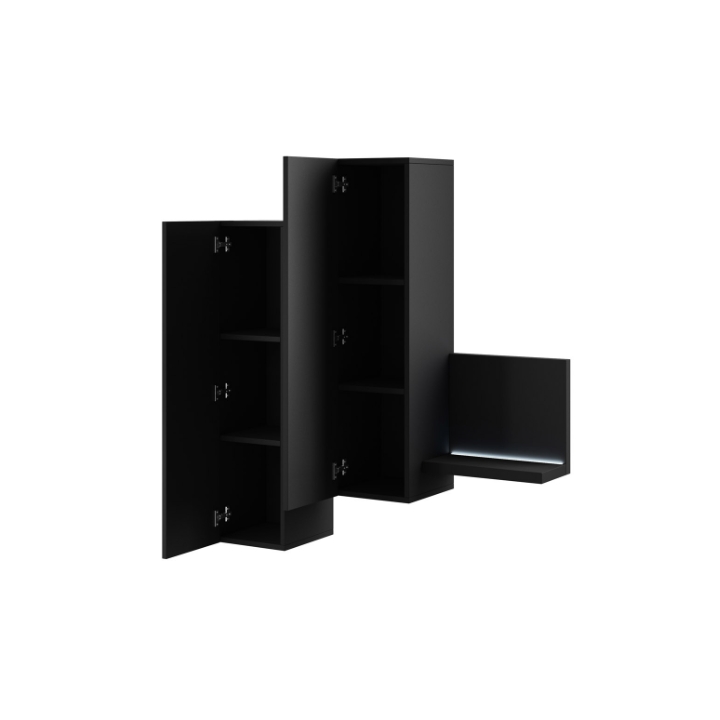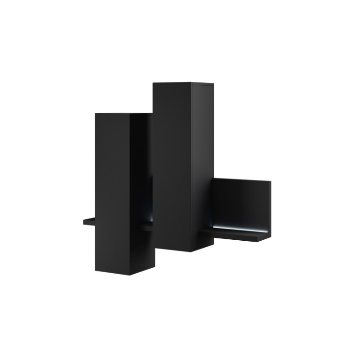 Witryna wisząca z półką Typ 04 z kolekcji Bota firmy Helvetia Wieruszów to propozycja stworzona z myślą o wnętrzach odważnych i nastawionych na nowoczesne rozwiązania aranżacyjne. Konstrukcja składa się z dwóch zamykanych szafek wiszących, w których umieszczono po dwie półki, oraz otwartej półki z tylną ścianką, ułożonej w asymetryczny sposób. Całość dopełnia wbudowane oświetlenie LED, które dodaje meblowi wyrazistego charakteru i podkreśla jego nietuzinkową formę.