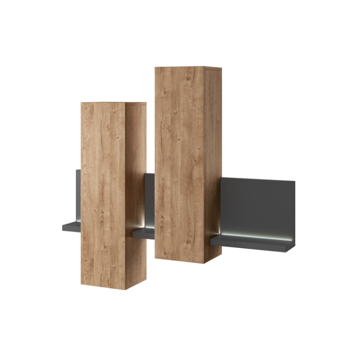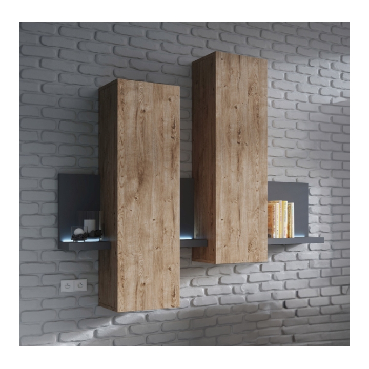 Witryna wisząca z półką Typ 04 z kolekcji Bota firmy Helvetia Wieruszów to propozycja stworzona z myślą o wnętrzach odważnych i nastawionych na nowoczesne rozwiązania aranżacyjne. Konstrukcja składa się z dwóch zamykanych szafek wiszących, w których umieszczono po dwie półki, oraz otwartej półki z tylną ścianką, ułożonej w asymetryczny sposób. Całość dopełnia wbudowane oświetlenie LED, które dodaje meblowi wyrazistego charakteru i podkreśla jego nietuzinkową formę.