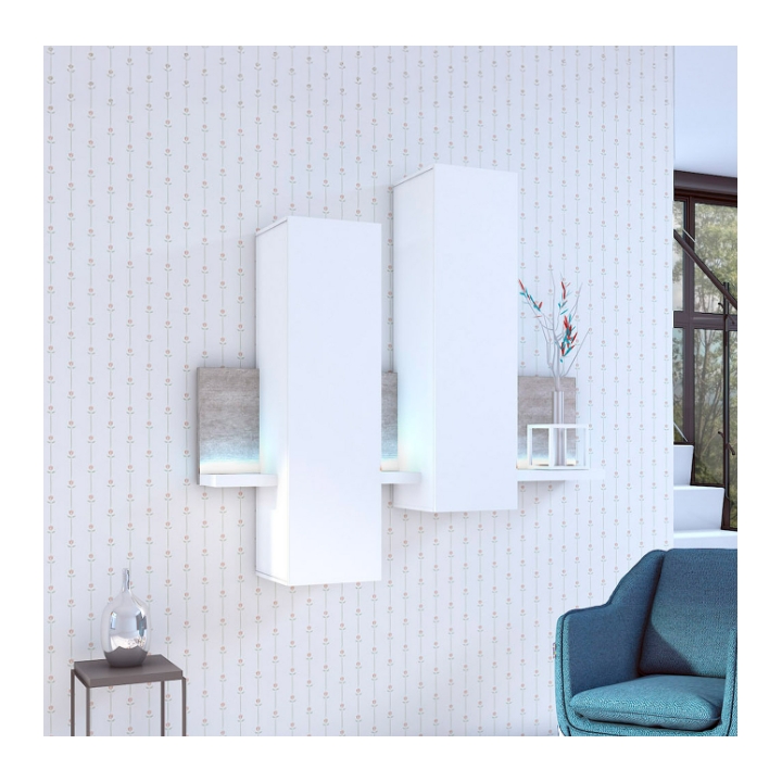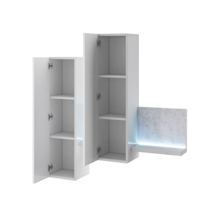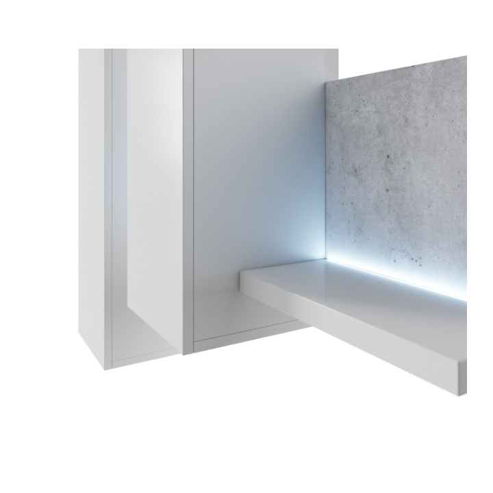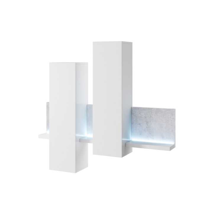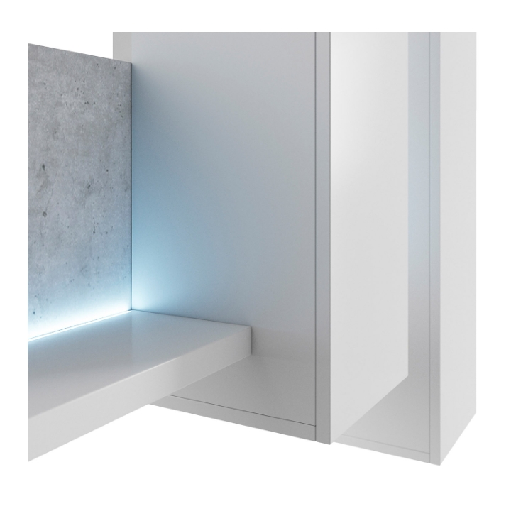 Witryna wisząca z półką Typ 04 z kolekcji Bota firmy Helvetia Wieruszów to propozycja stworzona z myślą o wnętrzach odważnych i nastawionych na nowoczesne rozwiązania aranżacyjne. Konstrukcja składa się z dwóch zamykanych szafek wiszących, w których umieszczono po dwie półki, oraz otwartej półki z tylną ścianką, ułożonej w asymetryczny sposób. Całość dopełnia wbudowane oświetlenie LED, które dodaje meblowi wyrazistego charakteru i podkreśla jego nietuzinkową formę.