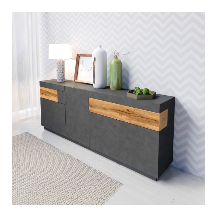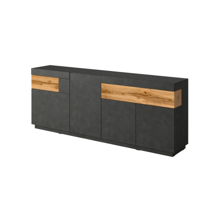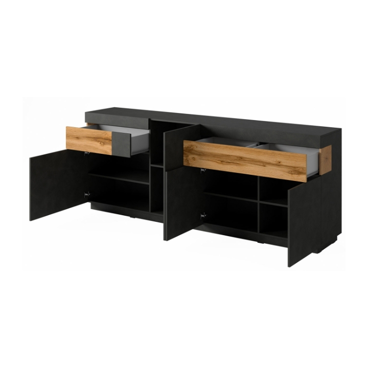 Mebel mierzy 219 cm szerokości, 85 cm wysokości i 40 cm głębokości, co czyni go proporcjonalnym, a zarazem pojemnym rozwiązaniem do salonu lub jadalni. Jego układ obejmuje cztery drzwi, za którymi umieszczono półki – po jednej za każdym skrzydłem. Uzupełnieniem całości są dwie szuflady, krótsza i dłuższa, których fronty wykonano w kontrastującym wybarwieniu dąb wotan, nadającym całości nieco bardziej wyrazisty charakter.