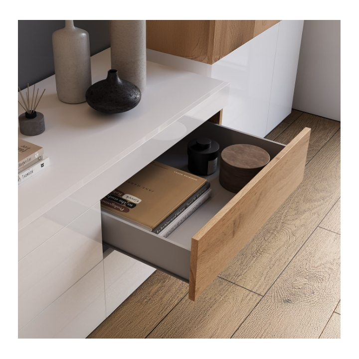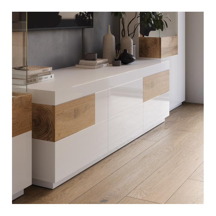 Korpus szafki mierzy 206 cm szerokości, 54 cm wysokości oraz 50 cm głębokości, co zapewnia przestrzeń odpowiednią do ustawienia większych telewizorów oraz dodatkowych elementów dekoracyjnych. Wewnątrz konstrukcji znajdują się 4 pojemne szuflady, umożliwiające uporządkowane przechowywanie akcesoriów elektronicznych czy domowych drobiazgów. Dwie z nich zostały wykonane w wyrazistym odcieniu dębu wotan, dzięki czemu bryła nabiera wyrazistego i nowoczesnego charakteru.