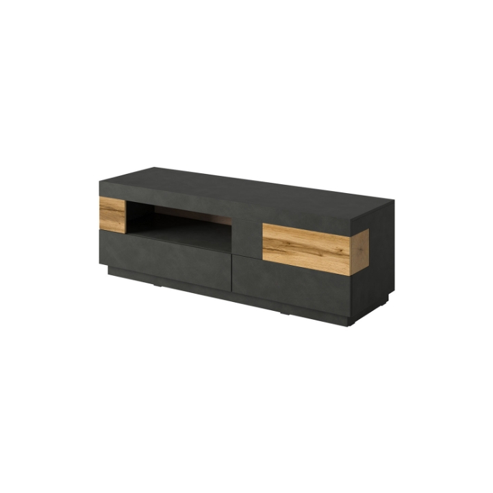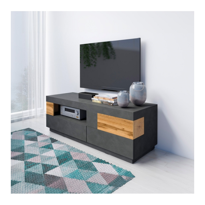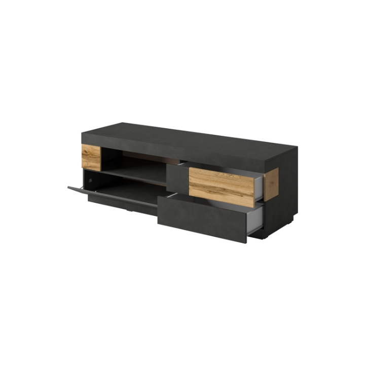 Mebel mierzy 160 cm szerokości, 54 cm wysokości oraz 50 cm głębokości, co sprawia, że pomimo kompaktowej formy oferuje sporą przestrzeń do zagospodarowania. Konstrukcja obejmuje dwie mniejsze szuflady, które doskonale sprawdzą się do przechowywania drobnych akcesoriów elektronicznych czy innych przedmiotów codziennego użytku. Obok umieszczono otwartą wnękę, przeznaczoną np. na dekoder, a poniżej klapę umożliwiającą schowanie dodatkowych elementów.