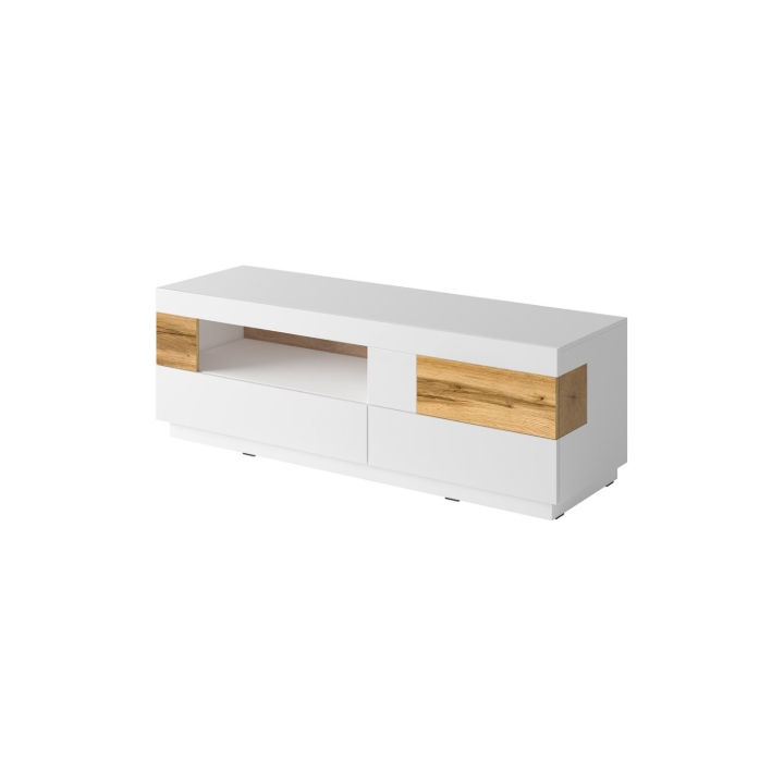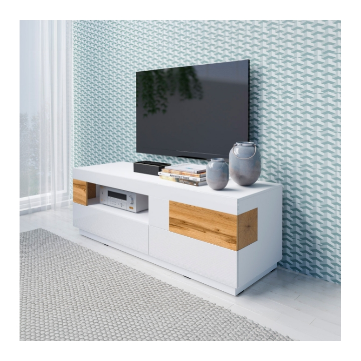 Mebel mierzy 160 cm szerokości, 54 cm wysokości oraz 50 cm głębokości, co sprawia, że pomimo kompaktowej formy oferuje sporą przestrzeń do zagospodarowania. Konstrukcja obejmuje dwie mniejsze szuflady, które doskonale sprawdzą się do przechowywania drobnych akcesoriów elektronicznych czy innych przedmiotów codziennego użytku. Obok umieszczono otwartą wnękę, przeznaczoną np. na dekoder, a poniżej klapę umożliwiającą schowanie dodatkowych elementów.