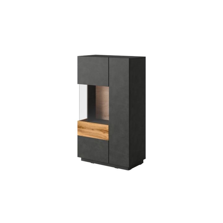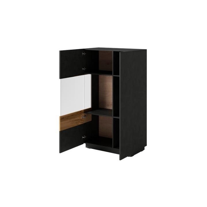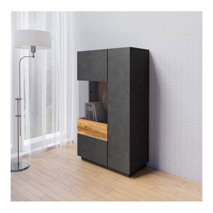 Do produkcji użyto płyty meblowej, a krawędzie w widocznych miejscach zostały wzmocnione obrzeżem ABS, co znacząco zwiększa odporność na codzienne użytkowanie. Fronty pozbawione uchwytów otwierają się dzięki mechanizmowi push-to-open, który nadaje całości czystą i nowoczesną formę. Opcjonalne oświetlenie LED pozwala dodatkowo wyeksponować zawartość i nadać witrynie nastrojowy charakter.