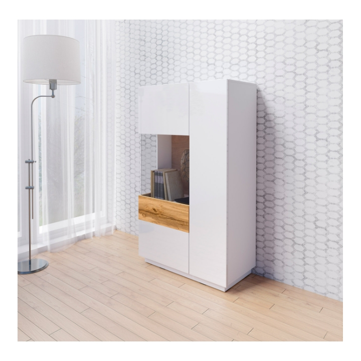 Do produkcji użyto płyty meblowej, a krawędzie w widocznych miejscach zostały wzmocnione obrzeżem ABS, co znacząco zwiększa odporność na codzienne użytkowanie. Fronty pozbawione uchwytów otwierają się dzięki mechanizmowi push-to-open, który nadaje całości czystą i nowoczesną formę. Opcjonalne oświetlenie LED pozwala dodatkowo wyeksponować zawartość i nadać witrynie nastrojowy charakter.