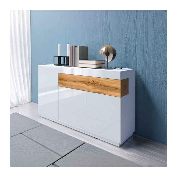 Korpus wykonano z płyty meblowej, a krawędzie zabezpieczono obrzeżami ABS, które podnoszą odporność na codzienne użytkowanie. Rezygnacja z tradycyjnych uchwytów na rzecz systemu push-to-open podkreśla prostotę i nowoczesne rozwiązania konstrukcyjne. Kontrastowe zestawienie kolorów – neutralnej podstawy z dębowym akcentem – dodaje całości wyrazistości i lekko przełamuje surowość formy.