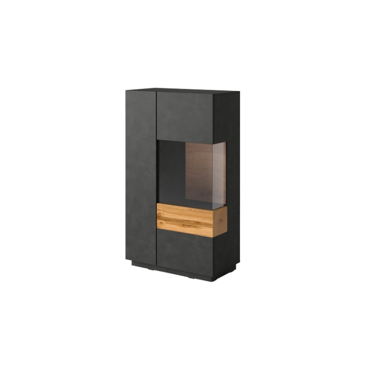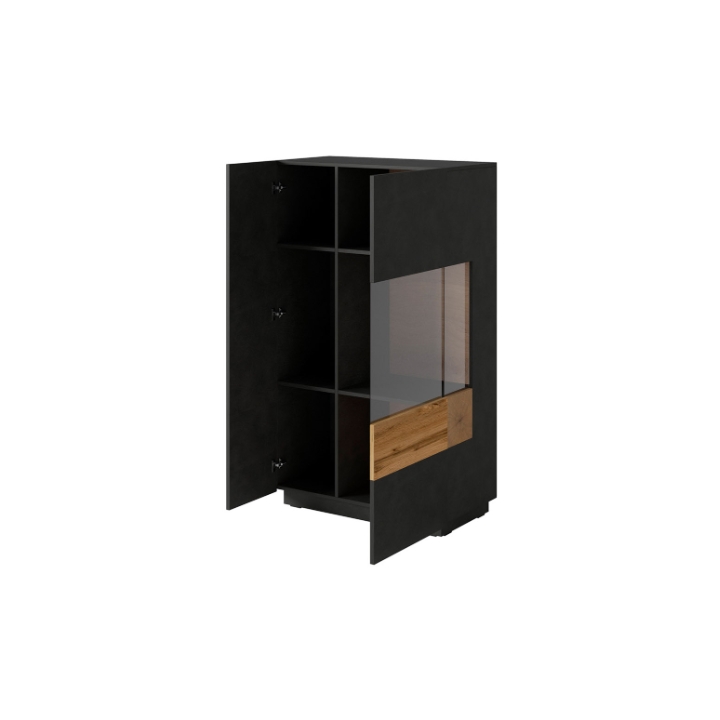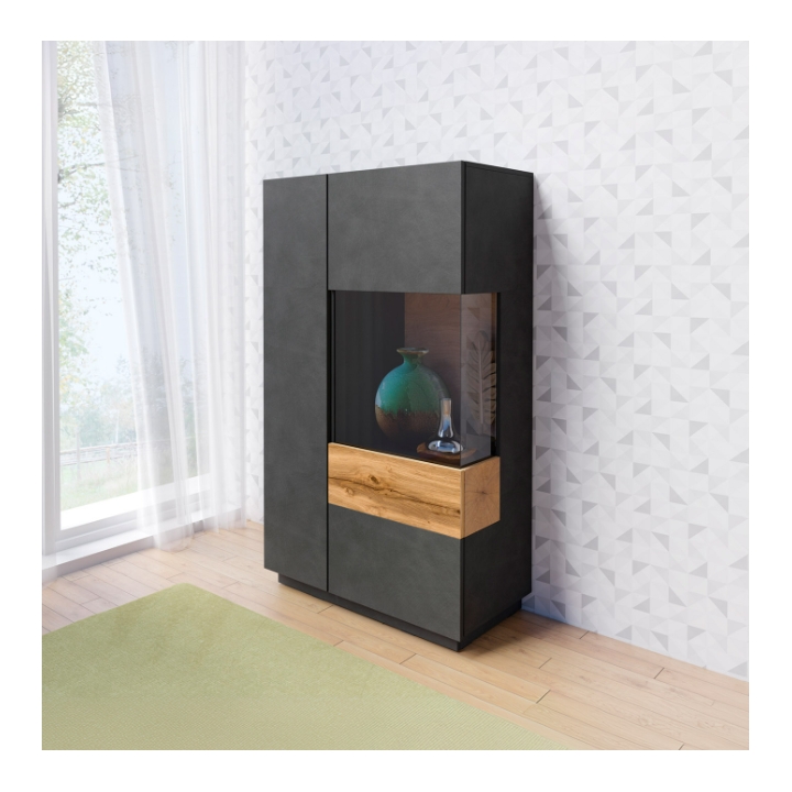 Korpus wykonano z solidnej płyty meblowej, a w miejscach szczególnie narażonych na użytkowanie zastosowano obrzeża ABS, co znacząco wzmacnia odporność na uszkodzenia. Zamiast tradycyjnych uchwytów użyto mechanizmu push-to-open, dzięki czemu całość prezentuje się jeszcze bardziej minimalistycznie. Opcjonalne oświetlenie LED nada wnętrzu witryny wyrazistości i podkreśli ekspozycję ulubionych przedmiotów.
