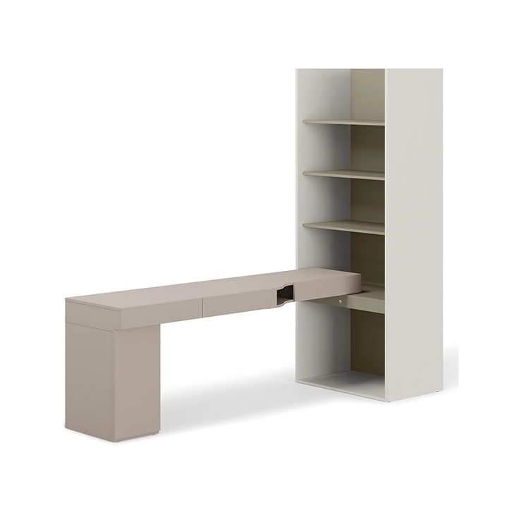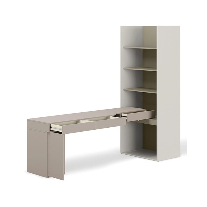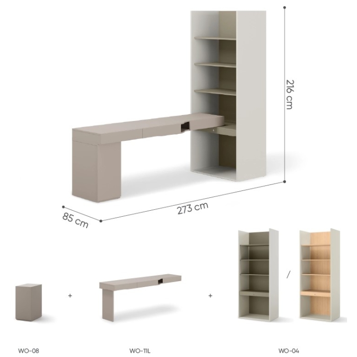 Zestaw wyróżnia się starannie dobraną kolorystyką: szampański, eukaliptus i clay grey, które nadają wnętrzu współczesny charakter i podkreślają indywidualny gust użytkownika. W jego skład wchodzą trzy elementy: kontenerek, biurko lewe oraz regał szeroki, które tworzą spójną, wielofunkcyjną kompozycję. Całość zaprojektowano tak, aby zmaksymalizować możliwości wykorzystania dostępnego miejsca bez zbędnych kompromisów.