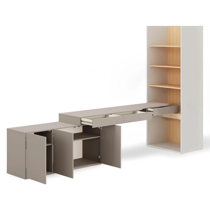 Zestaw zawiera biurko lewe, szeroki regał oraz elementy pełniące funkcję komody – wszystko w jednolitej strukturze, która pozwala na harmonijną organizację przestrzeni. Przemyślane rozmieszczenie 9 półek, 3 szuflad oraz 3 drzwi umożliwia logiczne uporządkowanie książek, materiałów szkolnych i rzeczy codziennego użytku. Waga całości wynosi 168 kg, co świadczy o solidności konstrukcji.