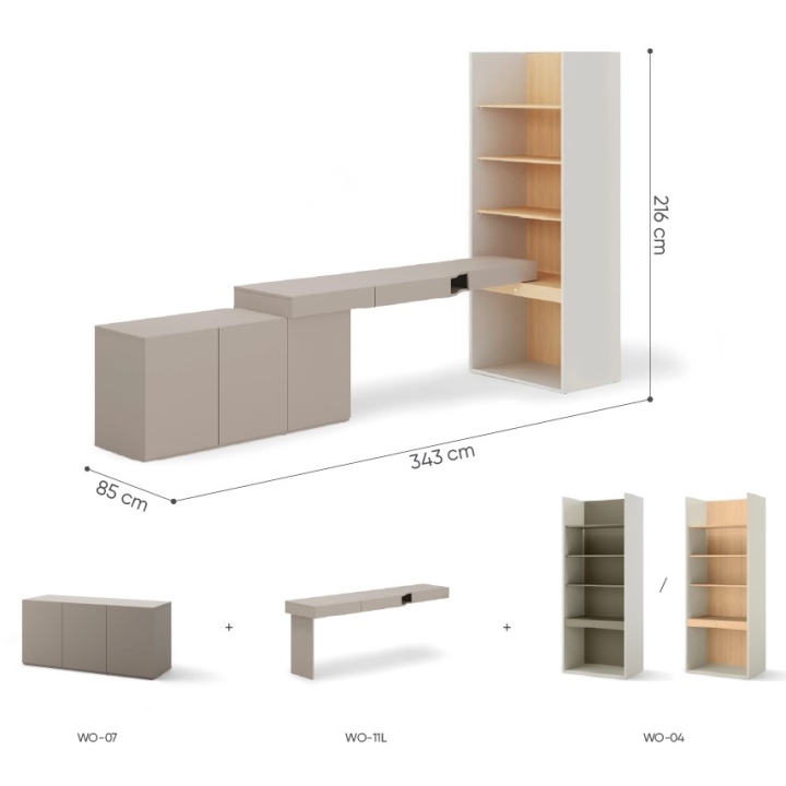 Zestaw SET-WOS8LVB to Meble młodzieżowe z kolekcji WOOW, oferują przemyślane rozwiązanie dla przestrzeni dorastającego dziecka. Ich geometryczna forma oraz starannie dobrane proporcje doskonale wpisują się we współczesne podejście do aranżacji wnętrz. Zestaw ten ma imponujące wymiary: szerokość 343 cm, wysokość 216 cm i głębokość 85 cm, co sprawia, że stanowi centralny punkt pokoju, oferując jednocześnie wiele możliwości aranżacyjnych.