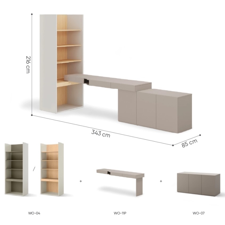 Zestaw SET-WOS8PVB to Meble młodzieżowe z kolekcji WOOW, oferują przemyślane rozwiązanie dla przestrzeni dorastającego dziecka. Ich geometryczna forma oraz starannie dobrane proporcje doskonale wpisują się we współczesne podejście do aranżacji wnętrz. Zestaw ten ma imponujące wymiary: szerokość 343 cm, wysokość 216 cm i głębokość 85 cm, co sprawia, że stanowi centralny punkt pokoju, oferując jednocześnie wiele możliwości aranżacyjnych.