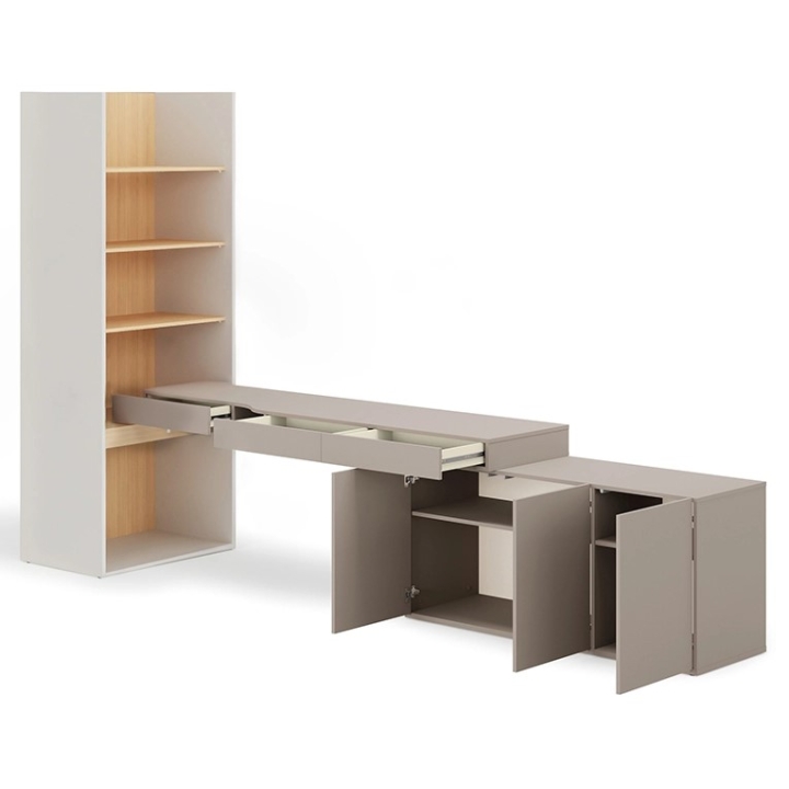 Zestaw zawiera biurko prawe, szeroki regał oraz elementy pełniące funkcję komody – wszystko w jednolitej strukturze, która pozwala na harmonijną organizację przestrzeni. Przemyślane rozmieszczenie 9 półek, 3 szuflad oraz 3 drzwi umożliwia logiczne uporządkowanie książek, materiałów szkolnych i rzeczy codziennego użytku. Waga całości wynosi 168 kg, co świadczy o solidności konstrukcji.